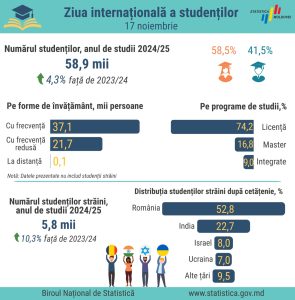 Ziua de 17 noiembrie a fost declarată oficial Ziua internaţională a studenţilor în anul 1941, de către Consiliul Internaţional al Studenţilor, pentru a comemora evenimentele din 1939 desfăşurate la Praga. În acest context, Biroul Național de Statistică al Republicii Moldova a făcut publice ultimele statistici cu referire la studenții din țara noastră.