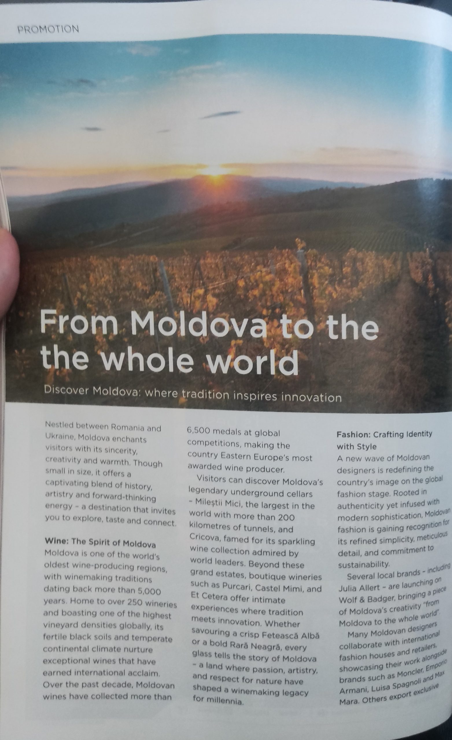 Republica Moldova este prezentată drept o destinație autentică, creativă și plină de căldură umană în una din edițiile revistei Wizz Air, distribuită la bordul aeronavelor care zboară din Chișinău către destinații europene. Sub sloganul „From Moldova to the whole world”, materialul invită pasagerii să descopere o țară mică ca suprafață, dar bogată în istorie, gusturi, stil și energie inovatoare.