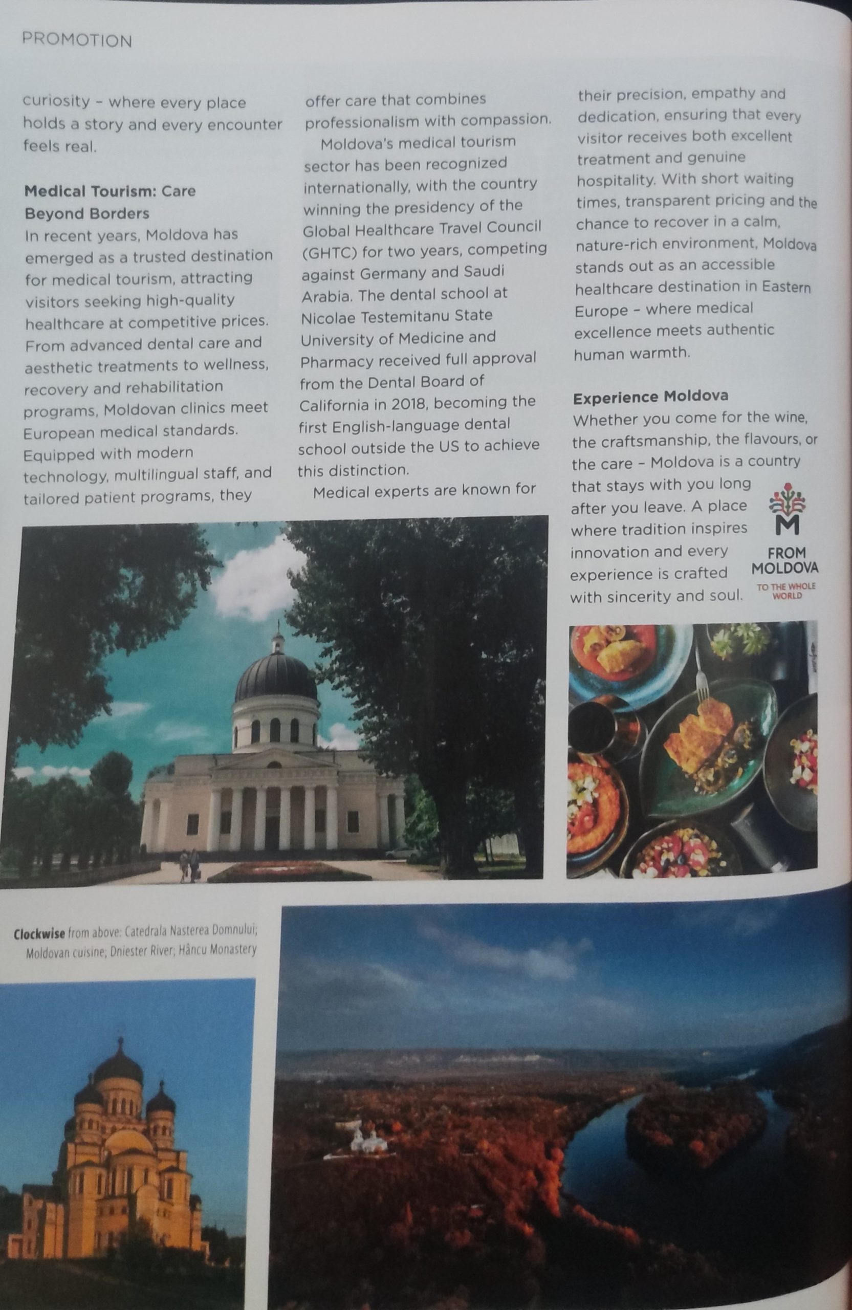 Un alt capitol al broșurii este dedicat turismului medical, domeniu în care Republica Moldova este prezentată ca o destinație „de încredere” pentru servicii de sănătate la prețuri competitive. Textul menționează tratamente stomatologice, servicii estetice și programe de recuperare, subliniind că instituțiile medicale ar respecta standardele europene.