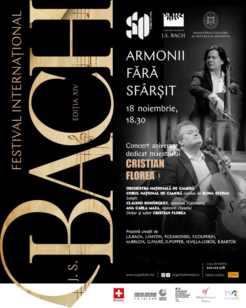 Pe 18 noiembrie, festivalul va continua cu spectacolul aniversar „Armonii fără sfârșit”, dedicat maestrului Cristian Florea – violoncelist, prim-dirijor al Orchestrei Naționale de Cameră, mentor și spirit fondator al Festivalului „J.S. Bach”.