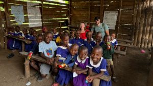 Cristina și Vitalie alături de copiii din Katetera, la o școală din localitate