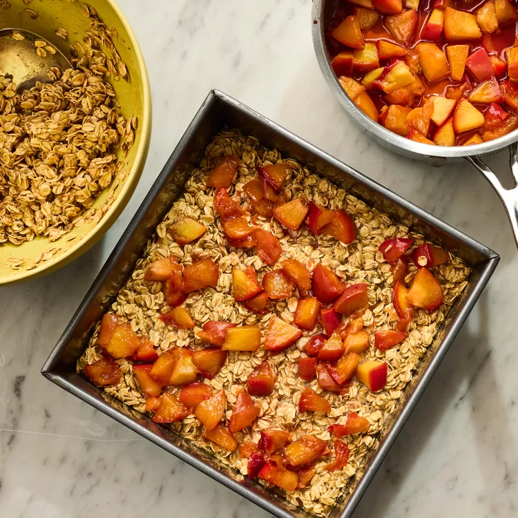 Încorporează fulgii de ovăz. Toarnă jumătate din compoziția de ovăz în tavă și nivelează. Adaugă un strat generos din amestecul de piersici, apoi acoperă cu restul de ovăz. Deasupra, distribuie uniform piersicile rămase.