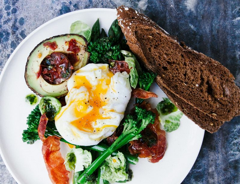 Două ouă fierte sau preparate sub formă de omletă cu spanac și roșii cherry, servite alături de două felii de pâine integrală prăjită și jumătate de avocado. Un pahar de suc proaspăt de grapefruit completează masa. Acest mic dejun combină proteine de calitate cu fibre și vitamine.
