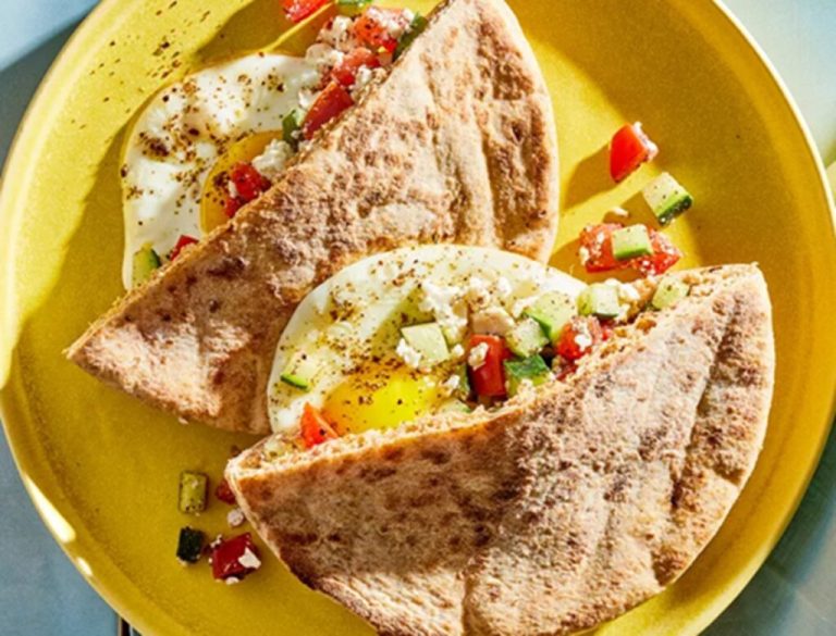 - Presară peste ouă restul de ¼ linguriță za’atar. Pune câte un ou în fiecare jumătate de pita.