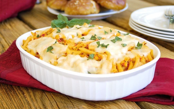 - Scurge pastele, păstrând cel puțin ½ cană apă în care au fiert paste. Toarnă și pastele scurse în același vas cu sosul. Adaugă apa pe care ai păstrat-o la sos și amestecă bine pentru a se combina toate ingredientele. Adaugă și puiul la paste și amestecă bine totul. Toarnă într-o tavă pentru cuptor și acoperă cu felii de mozzarella. Lasă la cuptor până începe să se rumenească, aproximativ 15 minute.