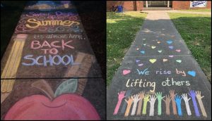 - Trotuar pictat cu cretă colorată – elevii își pot exprima emoțiile și creativitatea desenând mesaje de „bun venit”.