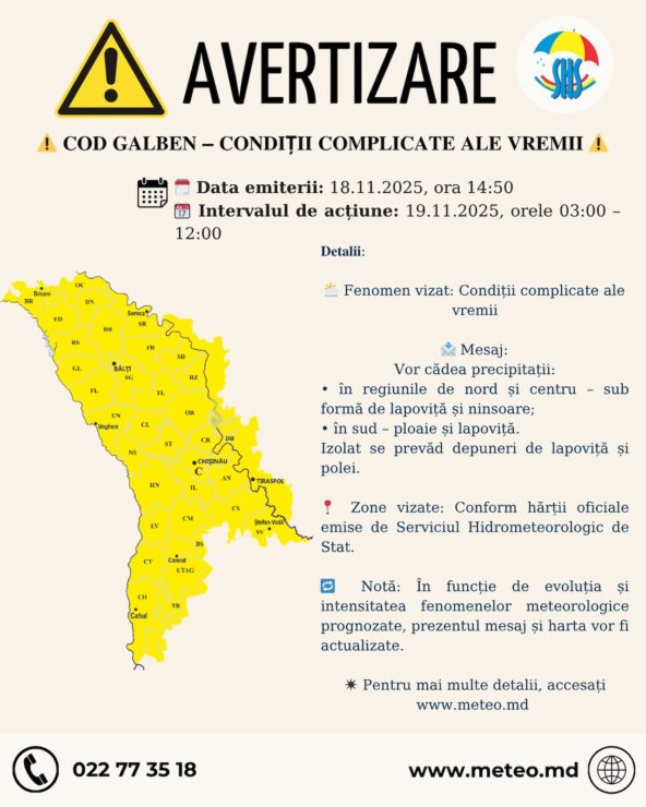 Serviciul Hidrometeorologic de Stat (SHS) a emis marți, 18 noiembrie, cod galben de „condiții complicate…