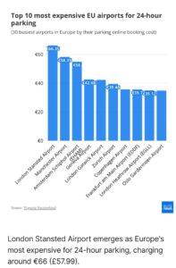 Aeroportul London Stansted este cel mai scump din Europa pentru parcarea de 24 de ore, cu un tarif de aproximativ 66 de euro (57,99 lire sterline).