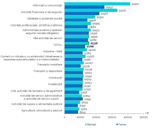 • informații și comunicații – salarii mai mari cu 39,2% (16 249,7 lei în plus);