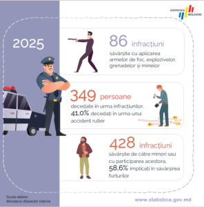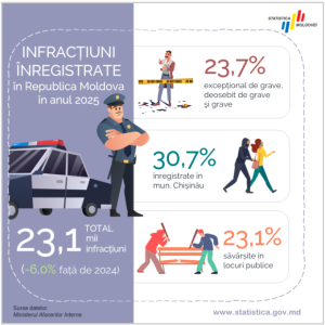 Conform datelor Ministerului Afacerilor Interne (MAI), în 2025, în Republica Moldova au fost înregistrate 23,1 mii infracțiuni, cu 6% mai puține decât în 2024 și cu aproape 15% mai puține față de 2021.
