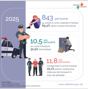 Conform datelor Ministerului Afacerilor Interne, în anul 2025, au fost înregistrate circa 10,5 mii persoane care au comis infracțiuni, cu 5,0% mai puțin, comparativ cu anul 2024. La 10 mii locuitori au revenit 43,9 infractori. La 10 mii copii în vârstă de 0-17 ani au revenit 10,5 minori care au săvârșit infracțiuni.