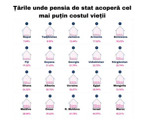 În Republica Moldova, pensiile de stat acoperă doar 42% din costul vieții, situându-se printre cele mai scăzute din Europa, alături de Georgia (22%), Albania (29%) și Ucraina (29%). Potrivit unui studiu realizat de firma de payroll și HR Moorepay, în 20 dintre cele 39 de țări europene analizate, pensiile nu sunt suficiente pentru a acoperi cheltuielile de bază (fără chirie).