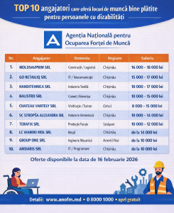 Agenția Națională pentru Ocuparea Forței de Muncă (ANOFM) a selectat cei mai atractivi 10 angajatori care oferă locuri de muncă stabile și salarii competitive pentru persoanele cu dizabilități. Informațiile de bazează pe declarațiile agenților economici și sunt înregistrate în baza de date a ANOFM.