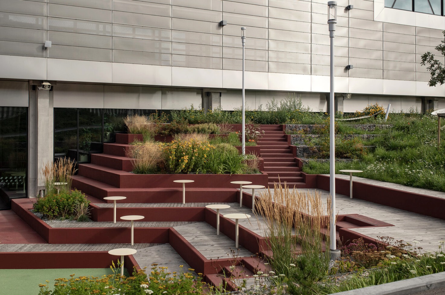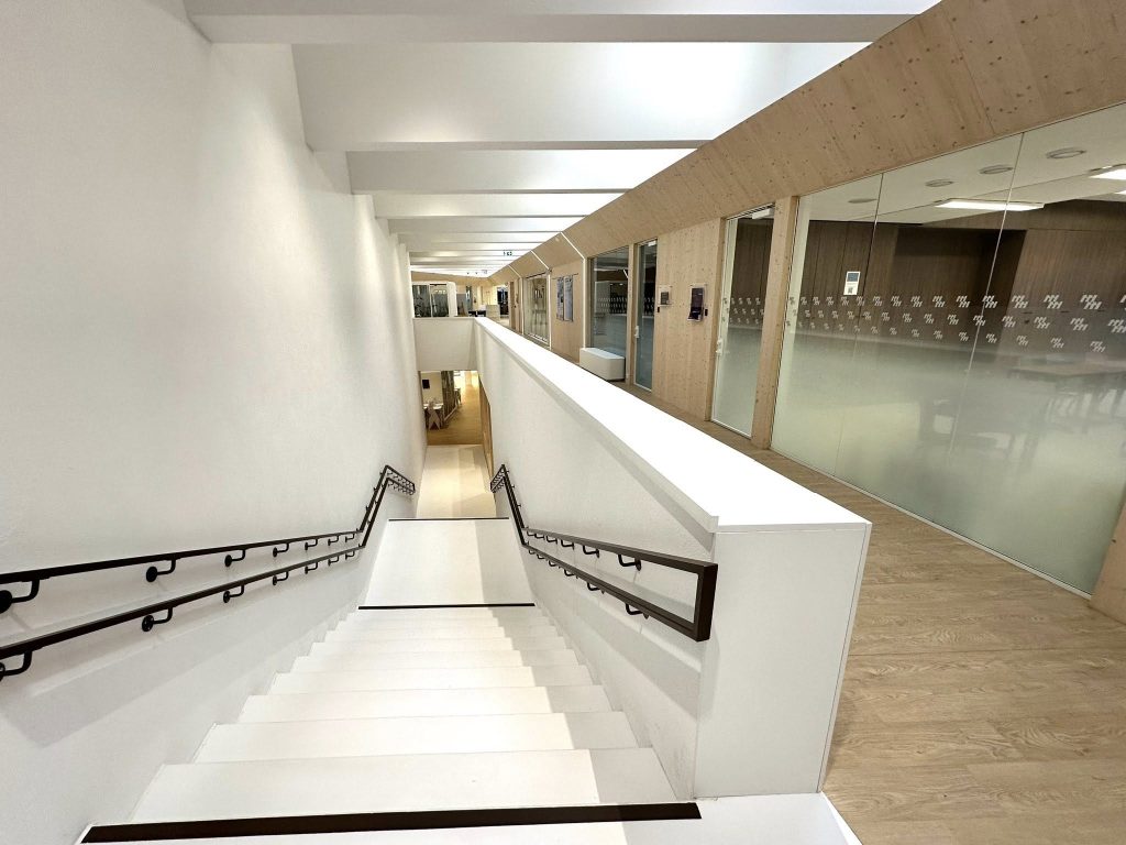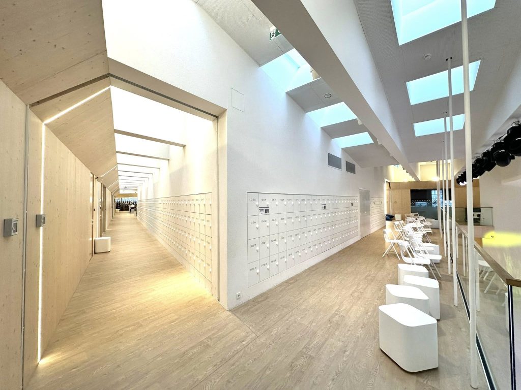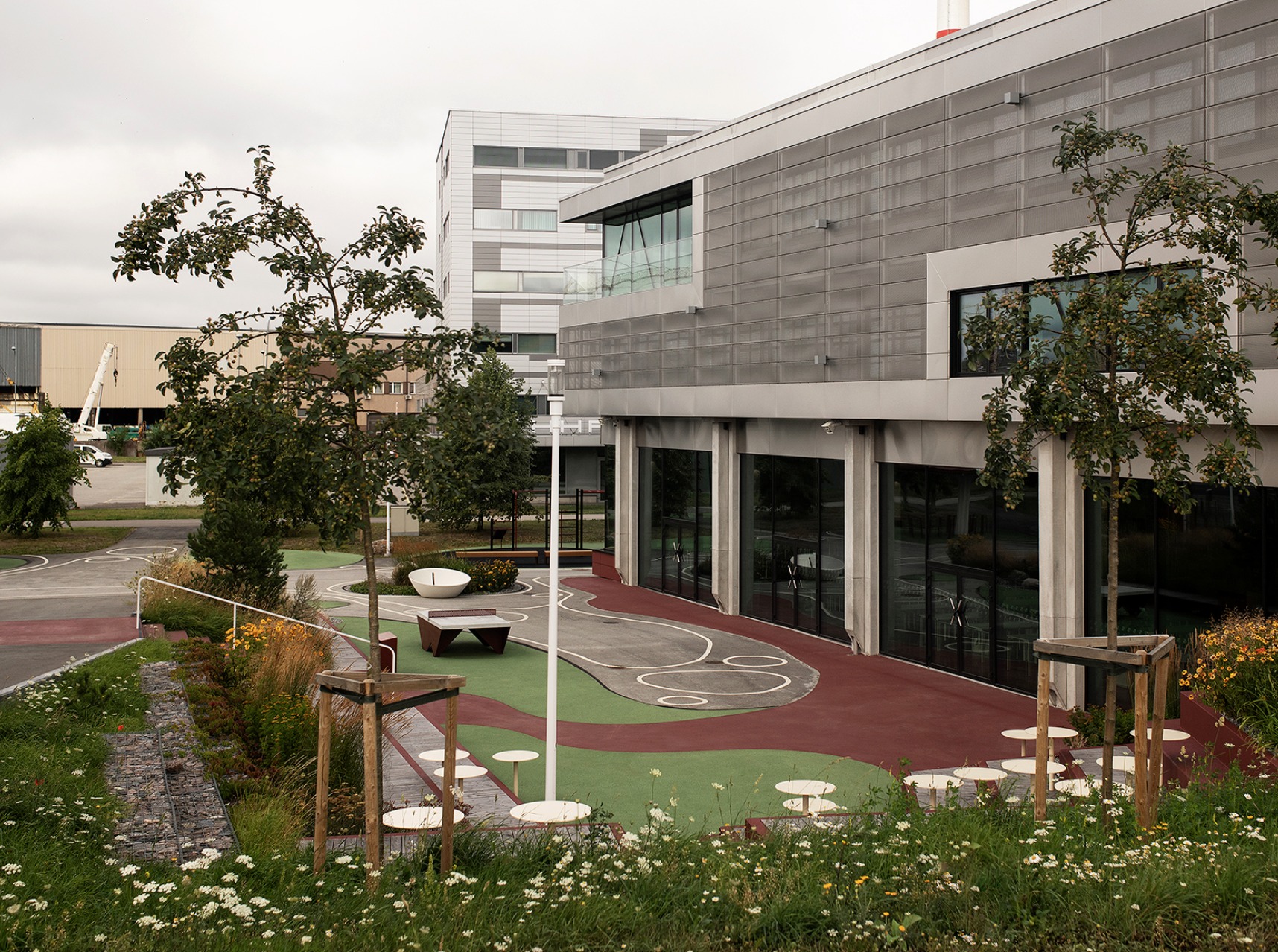 Clădirea școlii este înconjurată de spații verzi amenajate, cu echipamente de gimnastică în aer liber, terenuri de sport, mese de tenis de masă și zone de relaxare. Aceste facilități sunt accesibile comunității locale și vizitatorilor. De asemenea, există locuri de parcare pentru mai multe biciclete în aer liber.