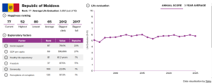 Republica Moldova ocupă locul 77 în clasamentul global al fericirii, cu un scor mediu de evaluare a vieții de 5,8 din 10. De-a lungul anilor, poziția țării a variat semnificativ: cea mai bună clasare a fost locul 52, iar cea mai slabă – locul 80, media situându-se în jurul poziției 65. Cea mai mare urcare în clasament a fost înregistrată în 2012, în timp ce cel mai accentuat declin a avut loc în 2017.