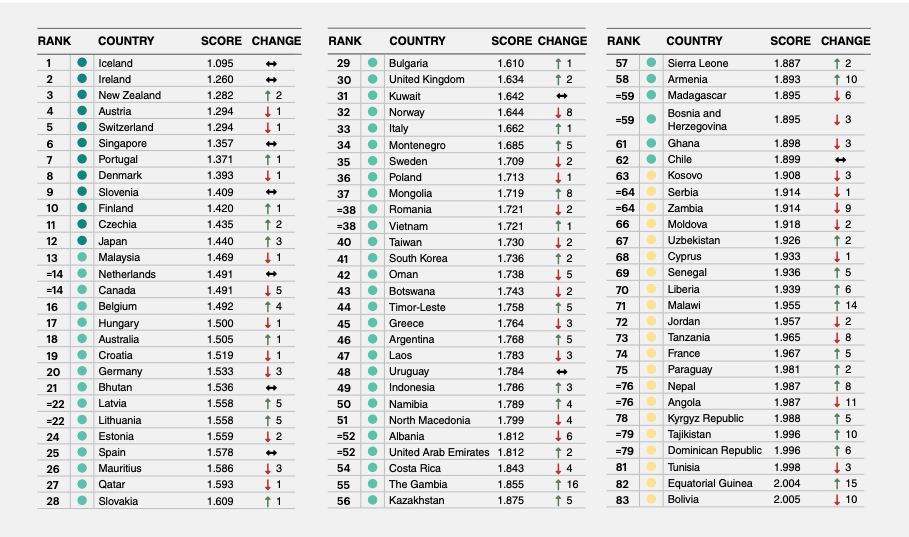 Astfel, clasată pe primul loc din 2008, Islanda rămâne cea mai pașnică națiune din lume, lider în toate cele trei domenii: siguranță și securitate, conflicte continue și militarizare. A înregistrat chiar și o îmbunătățire de 2% în acest an, mărind decalajul față de țara de pe locul doi în listă.