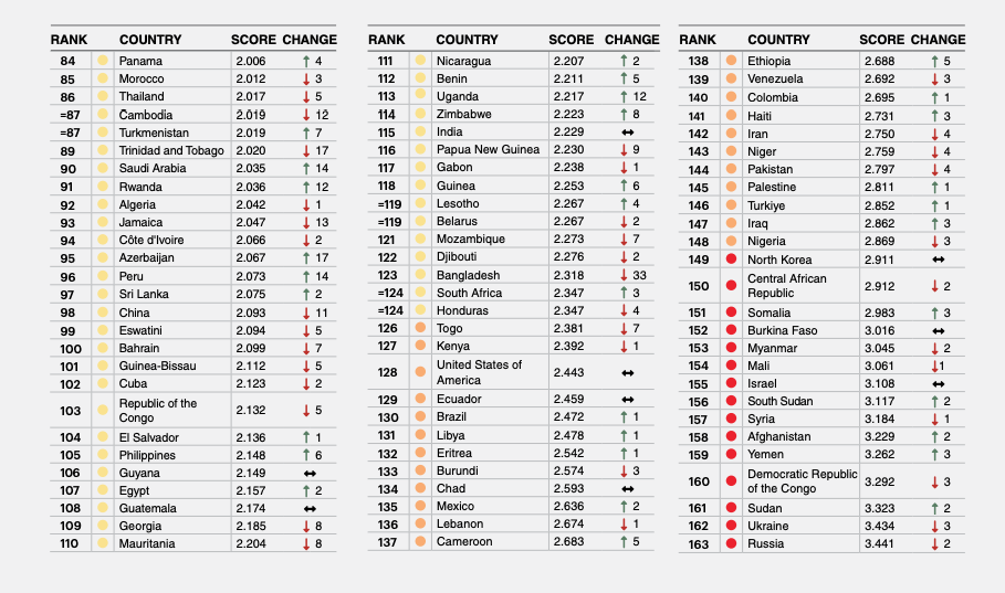 GPI, produs de Institutul pentru Economie și Pace , urmărește 23 de indicatori, de la conflicte externe și cheltuieli militare până la măsuri de siguranță și securitate precum terorismul și omuciderea.