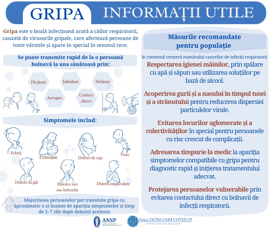De la începutul sezonului de monitorizare, 29 septembrie 2025 – 4 ianuarie 2026, au fost înregistrate 834 de cazuri de gripă, 26.591 de cazuri de IACRS și 257 de cazuri de COVID-19.