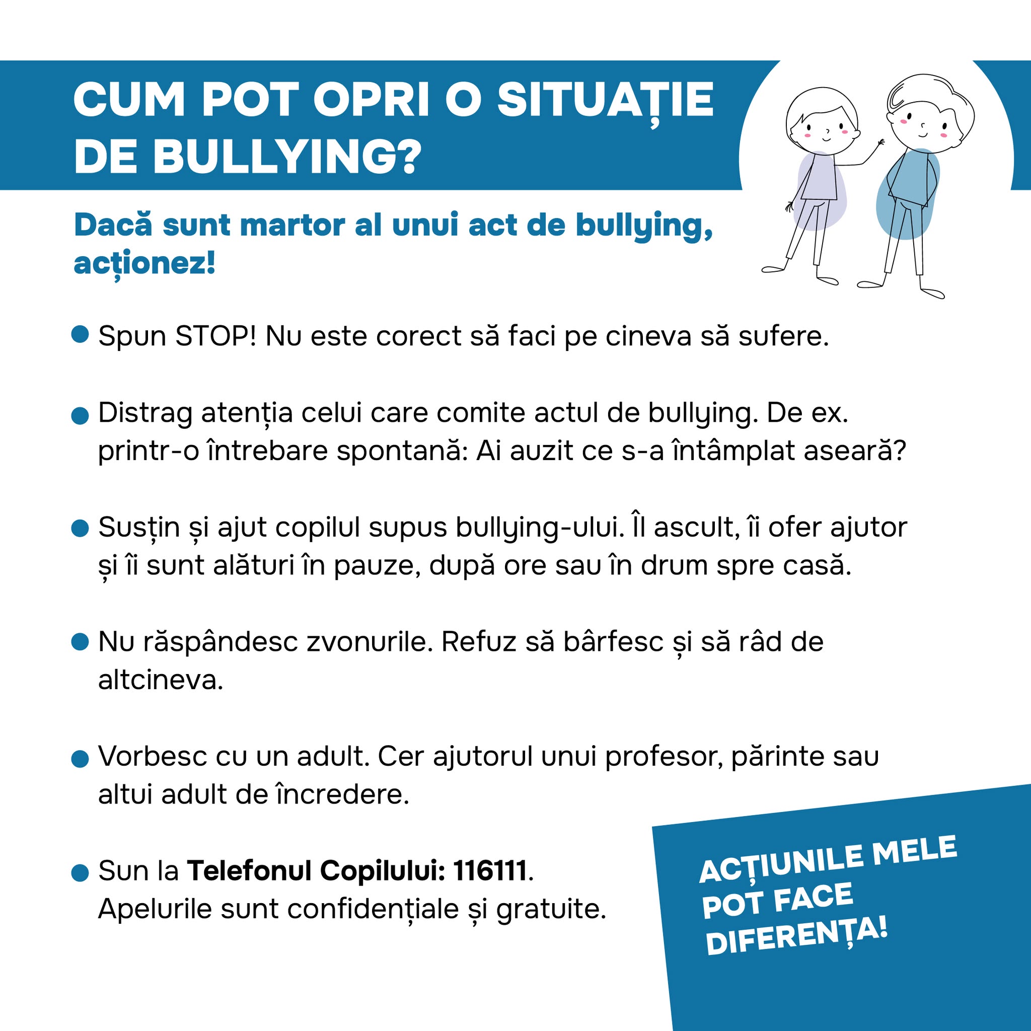 Totodată, în cinci instituții de învățământ va fi dezvoltat și pilotat un model complex de intervenție instituțională. Acestea vor beneficia de suport metodologic și mentorat în implementarea măsurilor integrate de prevenire și răspuns la cazurile de bullying, cu scopul consolidării mecanismelor interne de raportare, coordonare multidisciplinară și monitorizare a climatului școlar.