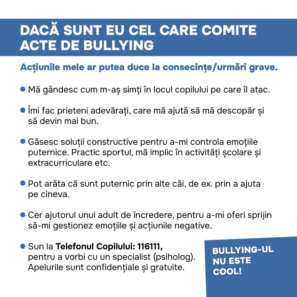 Citiți și: Bullying-ul, violență ignorată. Psiholog: „Nu poate fi justificat prin fraze de tipul «sunt copii»”