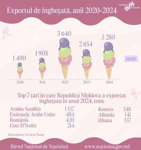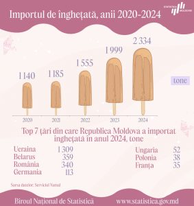 Biroul Național de Statistică (BNS) a publicat mai multe infografice care dezvăluie date esențiale despre evoluția producției, exportului și importului de înghețată în Republica Moldova în perioada 2020–2024.